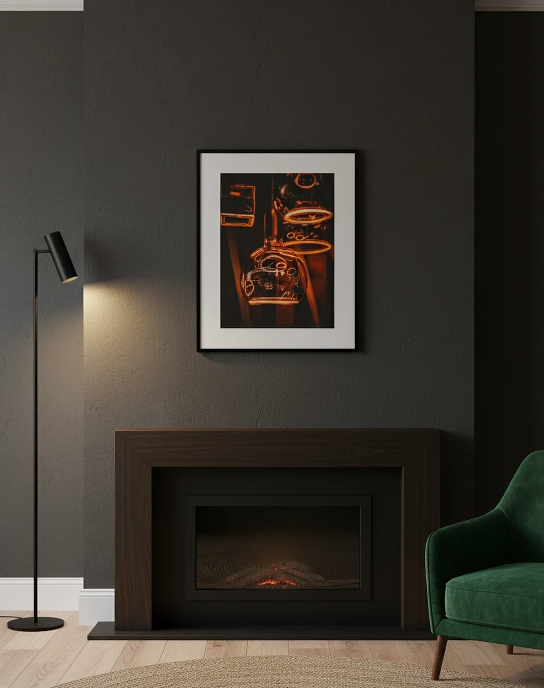 Raam: must või tume puit, valge paspartuu 5-8 cm – hoiab sooja valguse “hingama”.